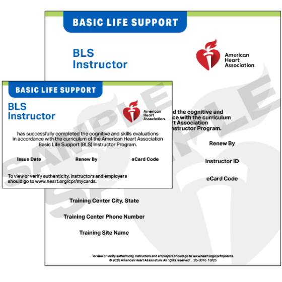 BLS Instructor eCards are issued by AHA Training Center Coordinators to Instructor Candidates who successfully complete an AHA BLS Instructor Essentials blended learning course, followed by required course monitoring by BLS Faculty and registration on Atlas. Once claimed by the Instructor, employers may validate AHA eCards at www.heart.org/cpr/mycards.