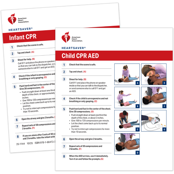 The Heartsaver Child & Infant CPR AED Wallet Card is an important resource for childcare professionals, babysitters, families, and anyone who cares for children. Conveniently sized to fit in a wallet or purse, this compact fold-out card shows the key steps of child CPR AED and infant CPR. The card is a helpful reminder in the event of a cardiac emergency. It can also be a promotional tool to emphasize the importance of CPR AED training.